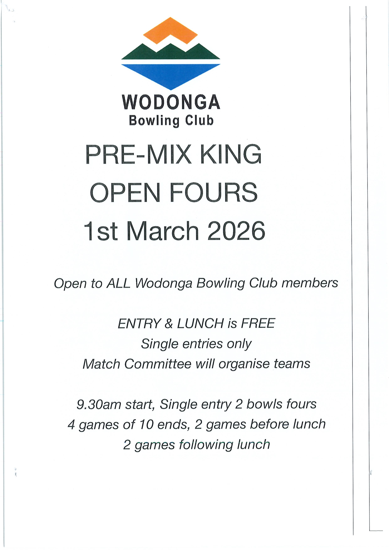 PREMIX KING Open Fours March 1st 2026Date January 15, 2026 - March 2, 2026Time 8:00 am - 5:00 pm Australia/MelbourneAdd To CalendarGoogle CalendarApple CalendarExport .ics fileOutlook LiveOutlook 360